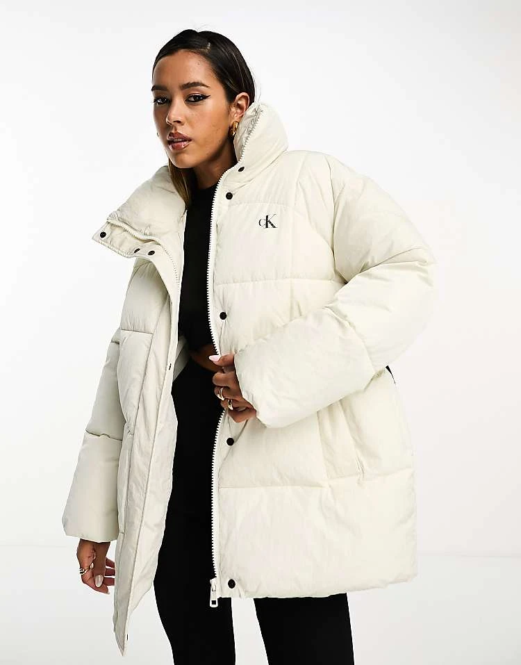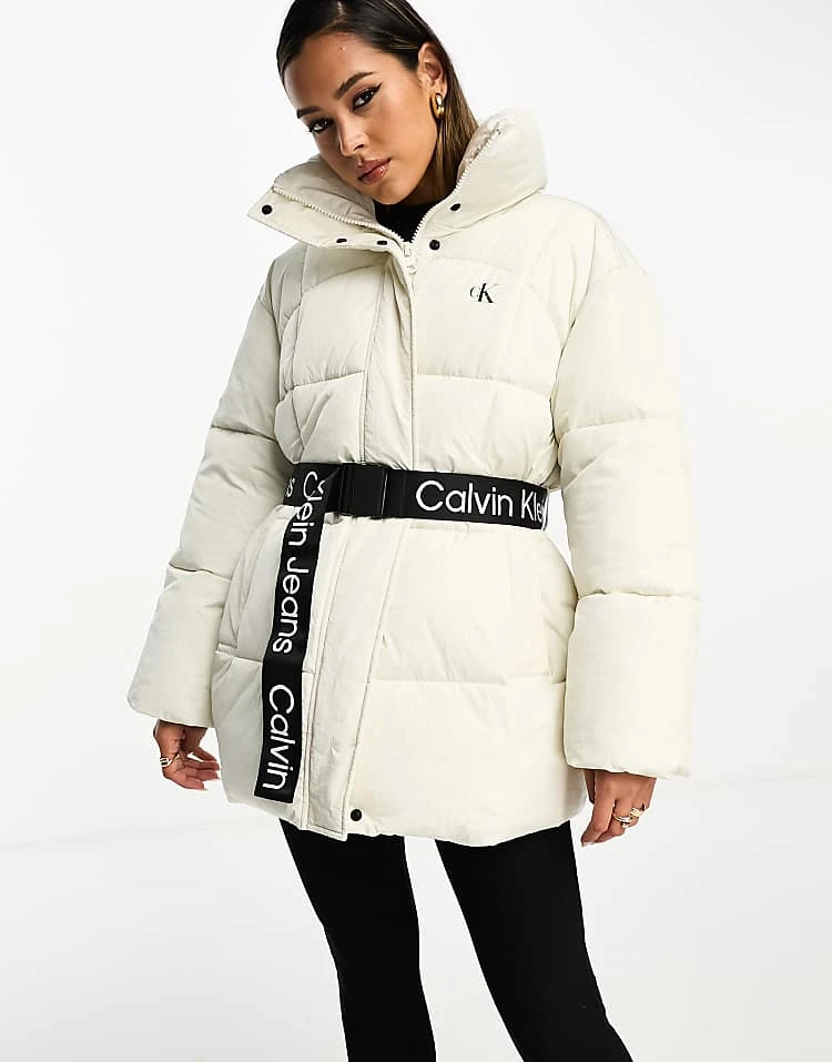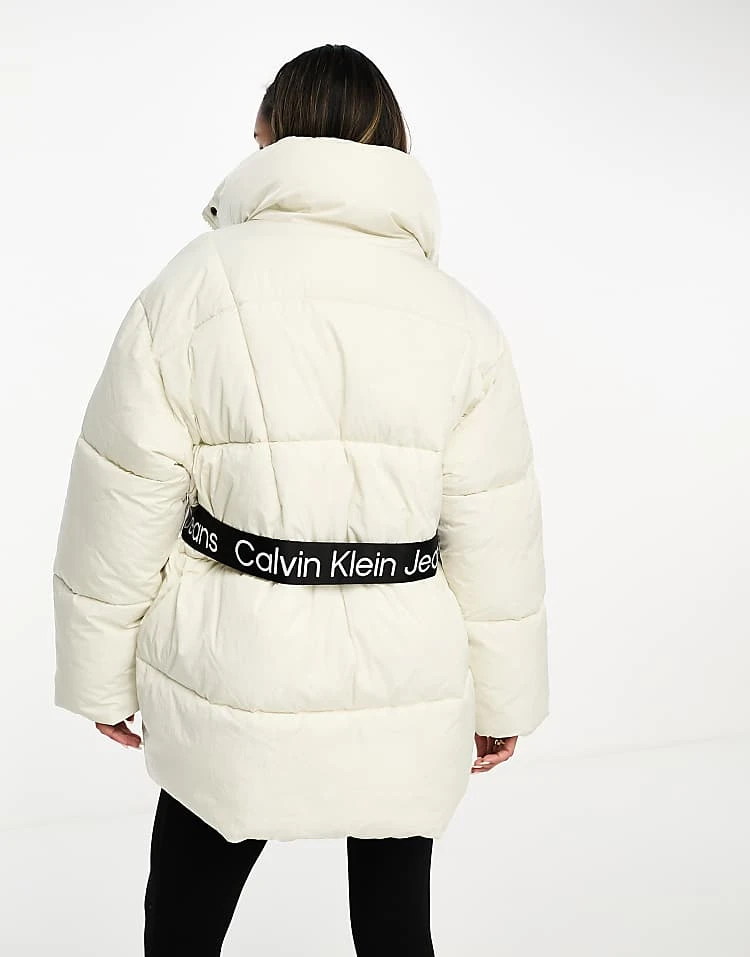 Calvin Klein Jeans Belted Long Puffer Jacket In White For Women Ivory