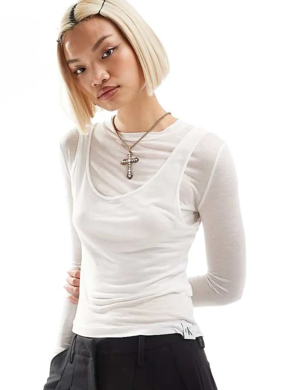 Calvin Klein Jeans Double Layer Sheer Top In White For Women Bright White