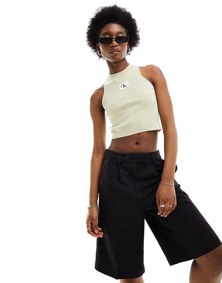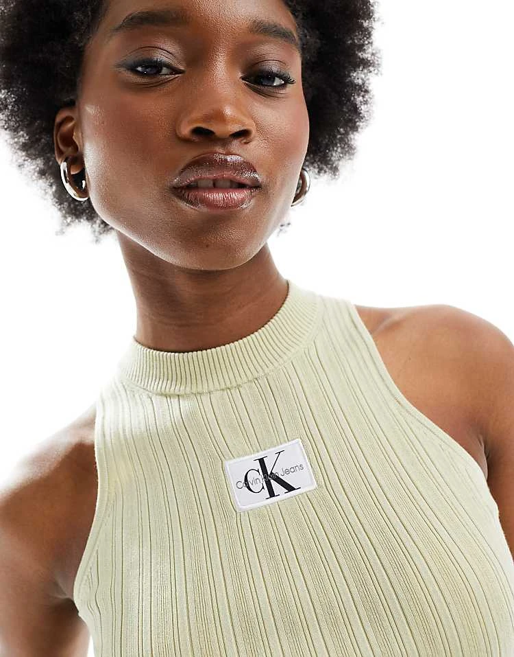 Calvin Klein Jeans Woven Label Knitted Tank In Beige For Women Green Haze