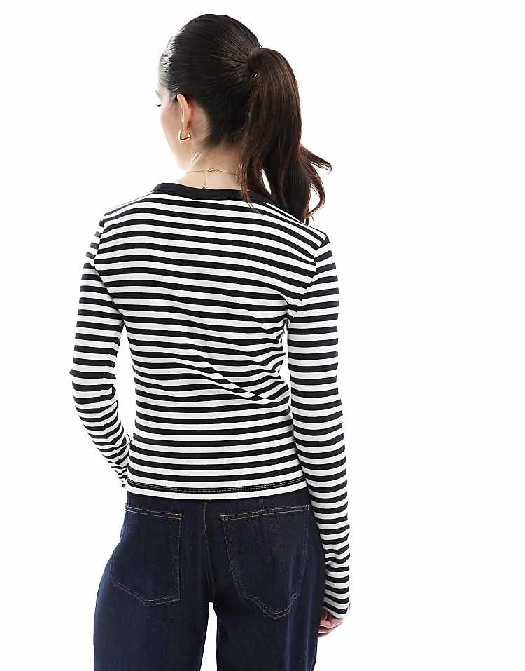 Calvin Klein Jeans Woven Label Stripe Long Sleeve Rib T-shirt In White & Black For Women Black / White