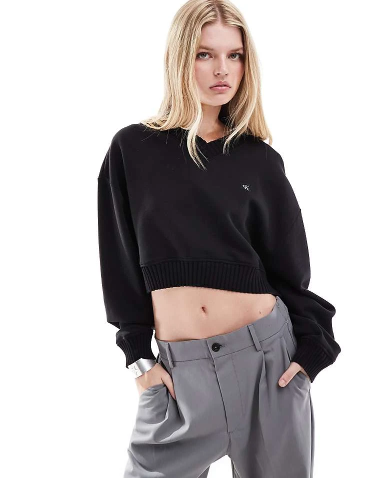 Calvin Klein Jeans Woven Label V-neck Sweatshirt In Black For Women Ck Black