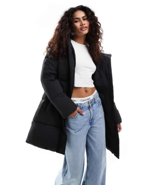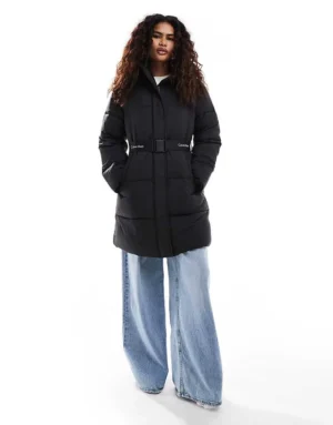 Calvin Klein Jeans Logo Belt Long Puffer Jacket In Black For Women Ck Black
