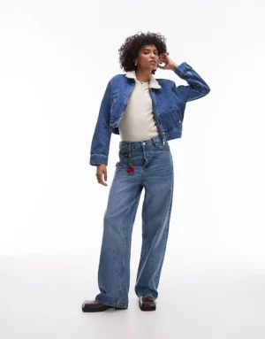 Calvin Klein Jeans Sherpa Collar Zip Thru Denim Jacket In Mid Wash For Women Denim Medium