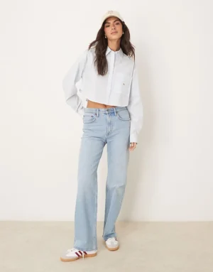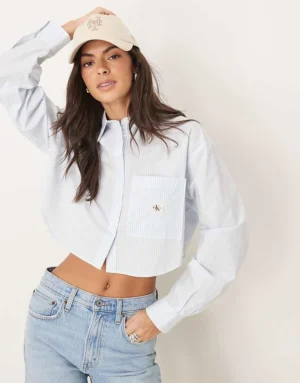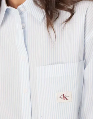 Calvin Klein Jeans Woven Label Cropped Shirt In Blue Stripe For Women Bright White / Blu